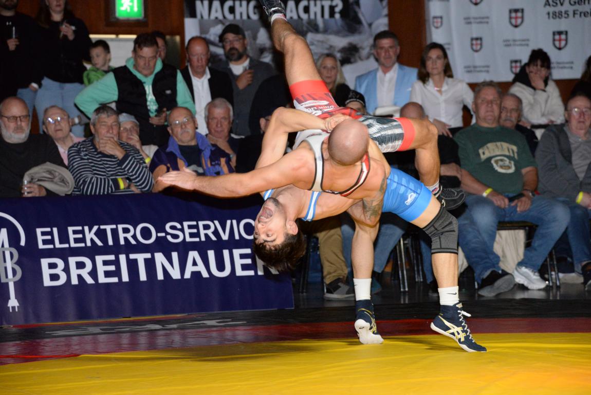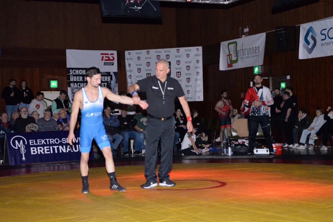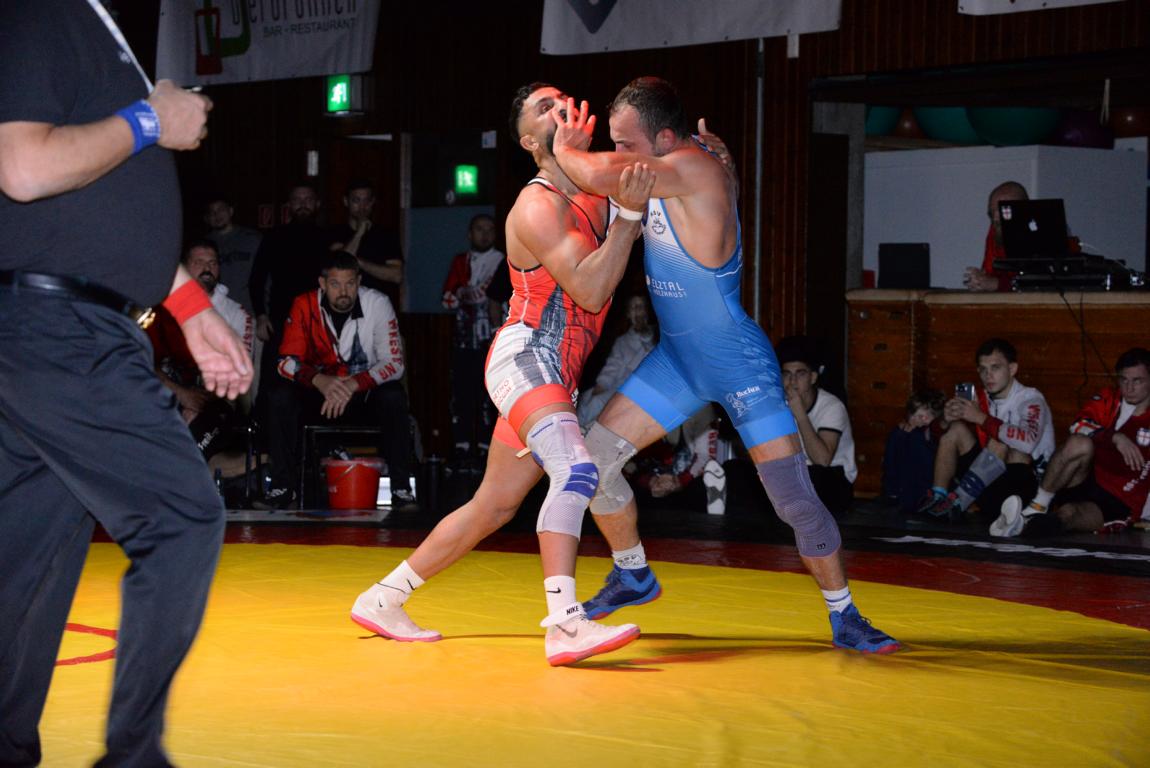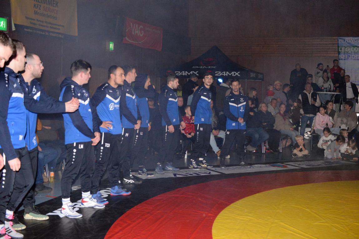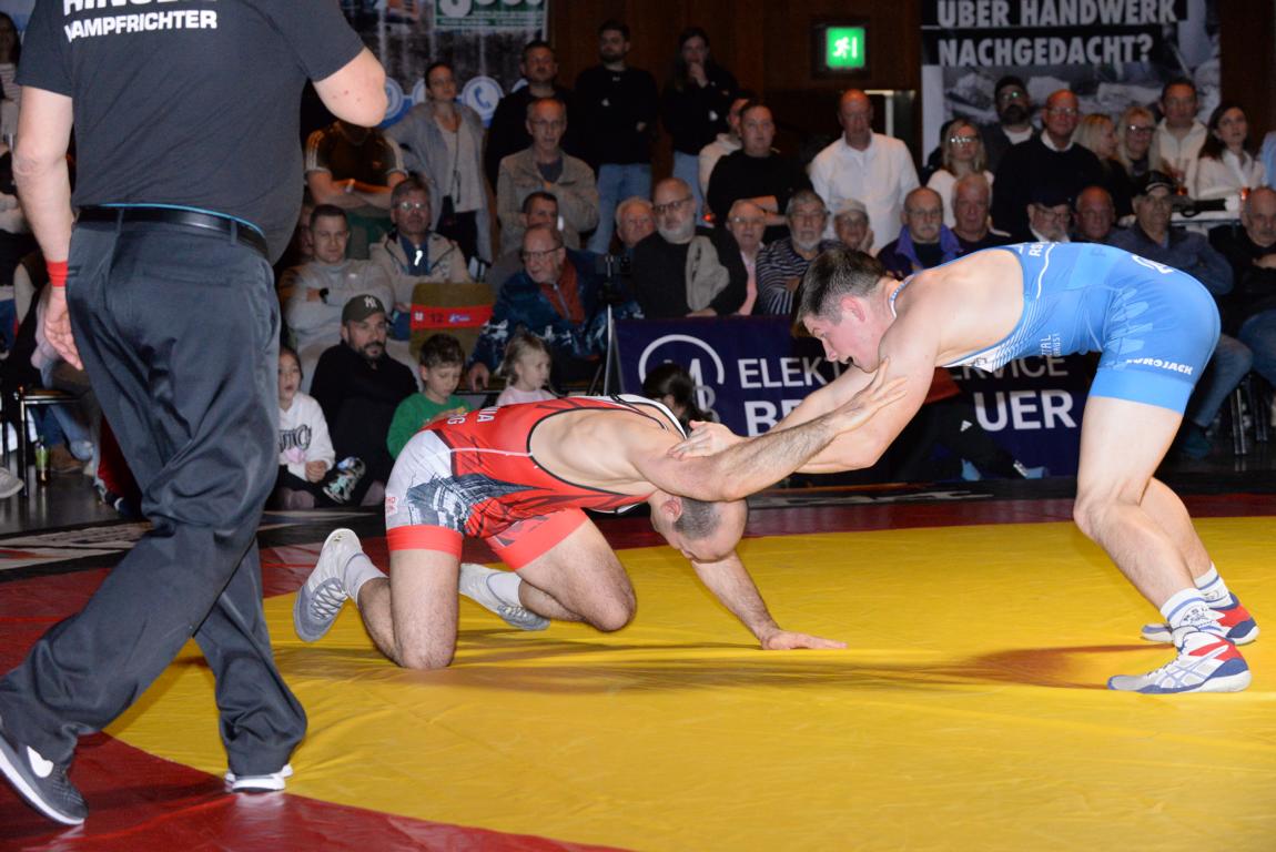 Nach dem kampflosen Sieg von Akaki Osiashvili (57 Kg, F) legte Marcus Mickein (130 Kg, G) gleich nach. Bereits nach einer Minute war er Überlegenheitssieger gegen Johannes Saleh. Einen weiteren Überlegenheitssieg steuerte Tamazi Gugunashvili (61 Kg, G) bei. Nach 1:30 Minuten stand sein Sieg über Ivaylo Dimov fest. Chancenlos war Ralph Moser (98 Kg, F) gegen erfahrenen Freistilspezialisten Michael Kaufmehl. Bis zehn Sekunden vor Schluss hatte es Johannes Hummel (66 Kg, F) geschafft, dem Team einen Mannschaftspunkt zu ergattern, dann erlitt er noch eine folgenschwere Schulterniederlage gegen Alish Alish. Nach der Halbzeit konnte Mykhailo Rudoi (86 Kg, G) den Punktestand für den RSV auf 8:13 erhöhen. Er verpasste es aber, gegen Moritz Bettge einen weiteren technischen Punkt zu erzielen, der dem Team einen wichtigen Zähler eingebracht hätte. Luan Lauer (71 Kg, G) brauchte eine kleine Anlaufzeit um seinen Kontrahenten Andrej Janzen in den Griff zu bekommen. Dann war er jedoch nicht mehr aufzuhalten und wurde nach knapp vier Minuten noch Schultersieger. Luca Munz traf nach seinem Aufrücken in die 80 Kg-Klasse überraschenderweise auf den erfahrenen und körperlich überlegenen Olegk Motsalin, dem er trotz heftiger Gegenwehr deutlich unterlag. Mit Daoud Issayev hatten die Gastgeber noch einen weiteren Top-Athleten, der gegen Pascal Fehrenbacher (75 Kg, F) einen Überlegenheitssieg erzielte. Beim Stande von 16:17 kam es zur finalen Begegnung zwischen Mohammad Damnkhoshk und Tomi Hinoveanu. Der vom Bundesligisten Mainz gekommene Damnkhoshk erwischte gleich den besseren Start und ging in Führung. Danach gelang es Tomi Hinoveanu nicht mehr heranzukommen und musste noch Punkte abgeben. Der 8:3 Punktesieg brachte den Gastgebern noch die wichtigen zwei Zähler zum Gesamtsieg.