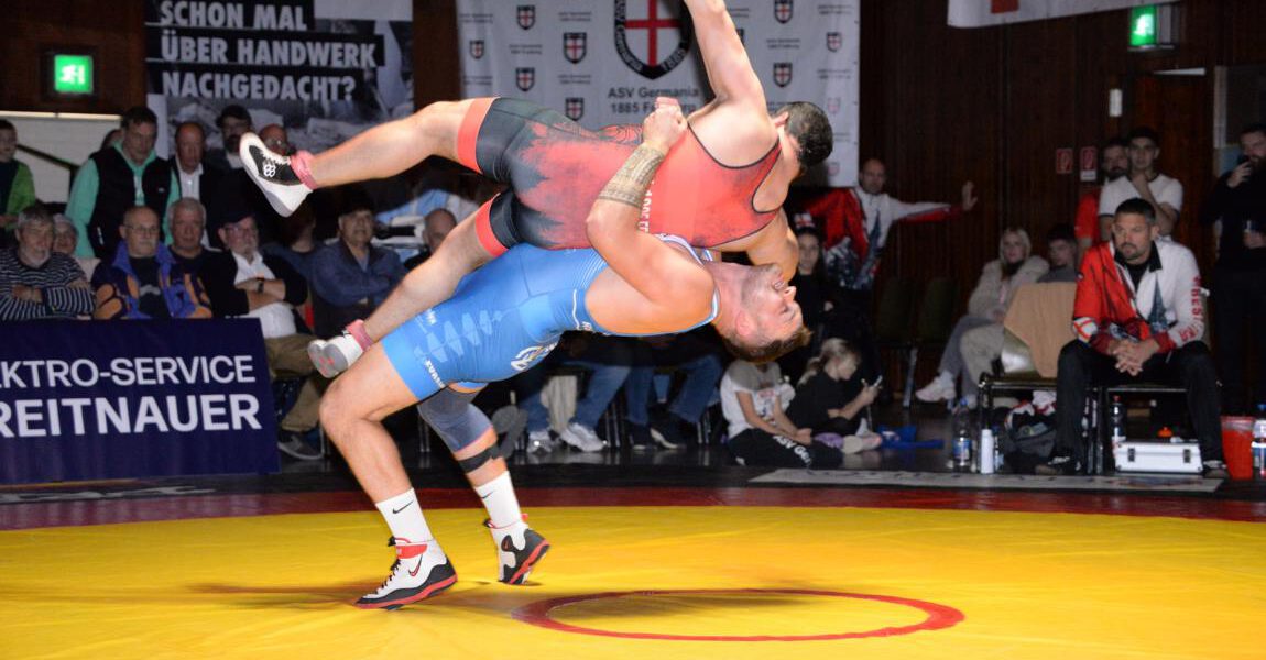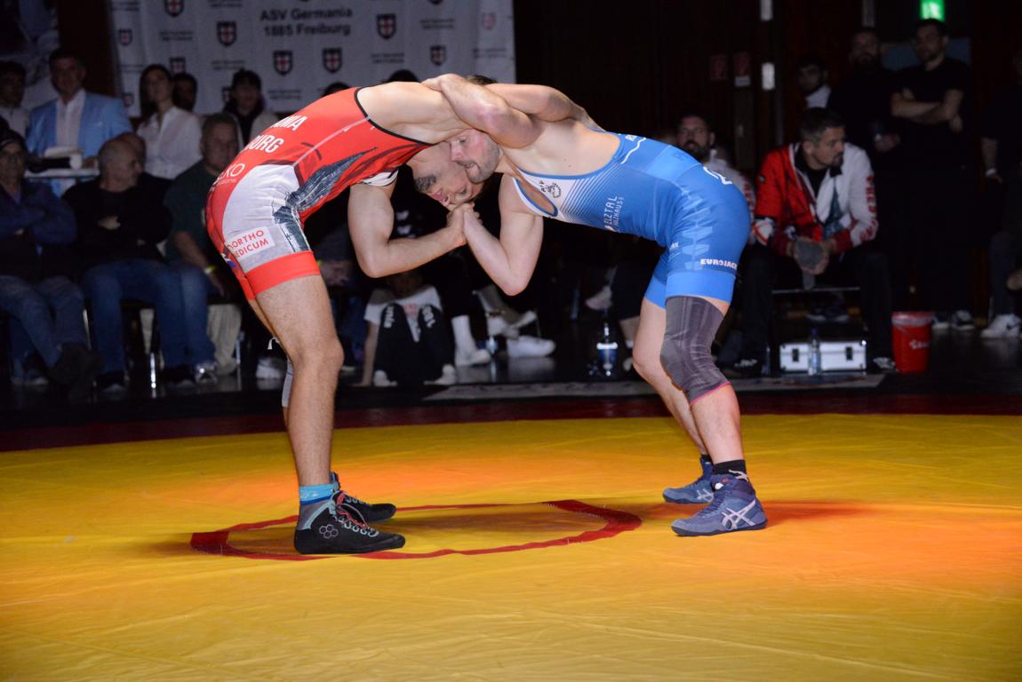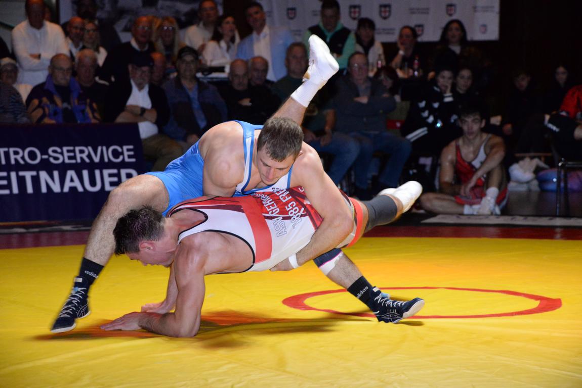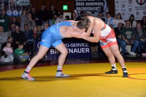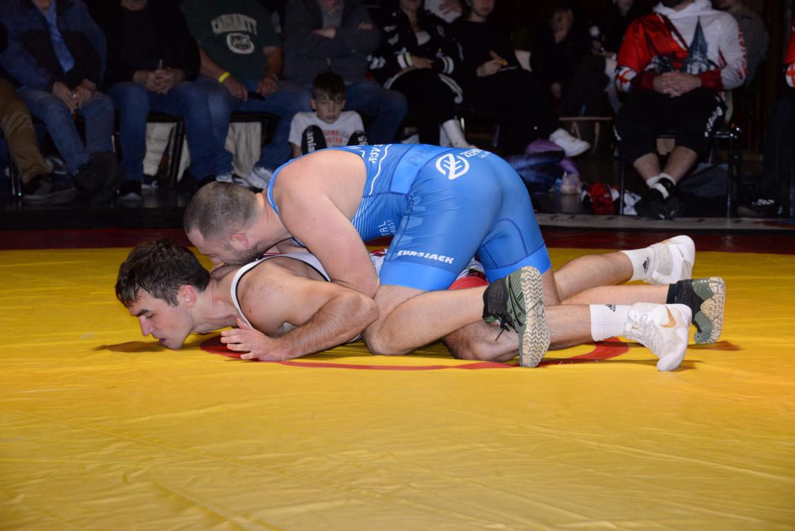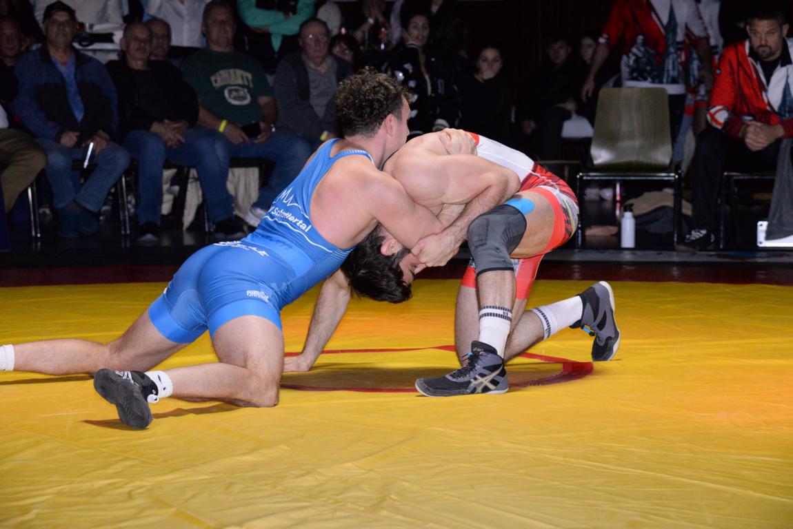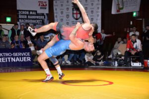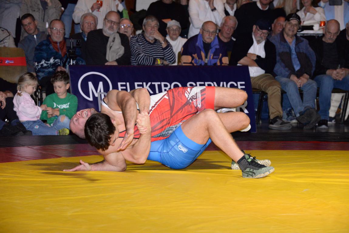 Nach dem kampflosen Sieg von Akaki Osiashvili (57 Kg, F) legte Marcus Mickein (130 Kg, G) gleich nach. Bereits nach einer Minute war er Überlegenheitssieger gegen Johannes Saleh. Einen weiteren Überlegenheitssieg steuerte Tamazi Gugunashvili (61 Kg, G) bei. Nach 1:30 Minuten stand sein Sieg über Ivaylo Dimov fest. Chancenlos war Ralph Moser (98 Kg, F) gegen erfahrenen Freistilspezialisten Michael Kaufmehl. Bis zehn Sekunden vor Schluss hatte es Johannes Hummel (66 Kg, F) geschafft, dem Team einen Mannschaftspunkt zu ergattern, dann erlitt er noch eine folgenschwere Schulterniederlage gegen Alish Alish. Nach der Halbzeit konnte Mykhailo Rudoi (86 Kg, G) den Punktestand für den RSV auf 8:13 erhöhen. Er verpasste es aber, gegen Moritz Bettge einen weiteren technischen Punkt zu erzielen, der dem Team einen wichtigen Zähler eingebracht hätte. Luan Lauer (71 Kg, G) brauchte eine kleine Anlaufzeit um seinen Kontrahenten Andrej Janzen in den Griff zu bekommen. Dann war er jedoch nicht mehr aufzuhalten und wurde nach knapp vier Minuten noch Schultersieger. Luca Munz traf nach seinem Aufrücken in die 80 Kg-Klasse überraschenderweise auf den erfahrenen und körperlich überlegenen Olegk Motsalin, dem er trotz heftiger Gegenwehr deutlich unterlag. Mit Daoud Issayev hatten die Gastgeber noch einen weiteren Top-Athleten, der gegen Pascal Fehrenbacher (75 Kg, F) einen Überlegenheitssieg erzielte. Beim Stande von 16:17 kam es zur finalen Begegnung zwischen Mohammad Damnkhoshk und Tomi Hinoveanu. Der vom Bundesligisten Mainz gekommene Damnkhoshk erwischte gleich den besseren Start und ging in Führung. Danach gelang es Tomi Hinoveanu nicht mehr heranzukommen und musste noch Punkte abgeben. Der 8:3 Punktesieg brachte den Gastgebern noch die wichtigen zwei Zähler zum Gesamtsieg.